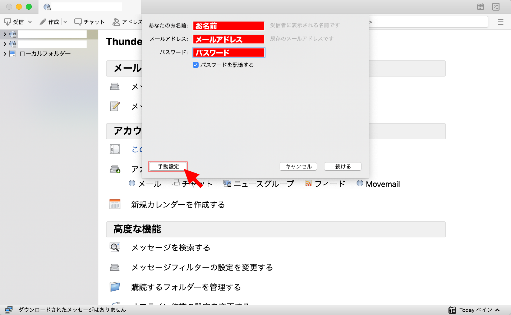 1. Thunderbirdを起動すると以下の画面が出るので、設定を入力し【手動設定】をクリック