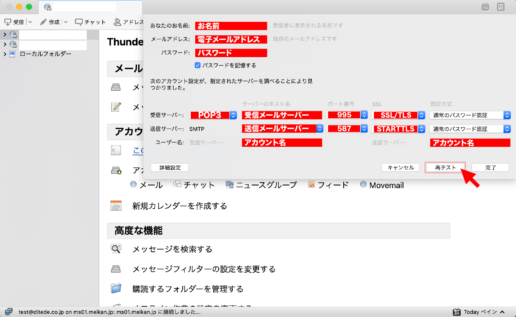2. 設定情報を入力し、【再テスト】をクリック