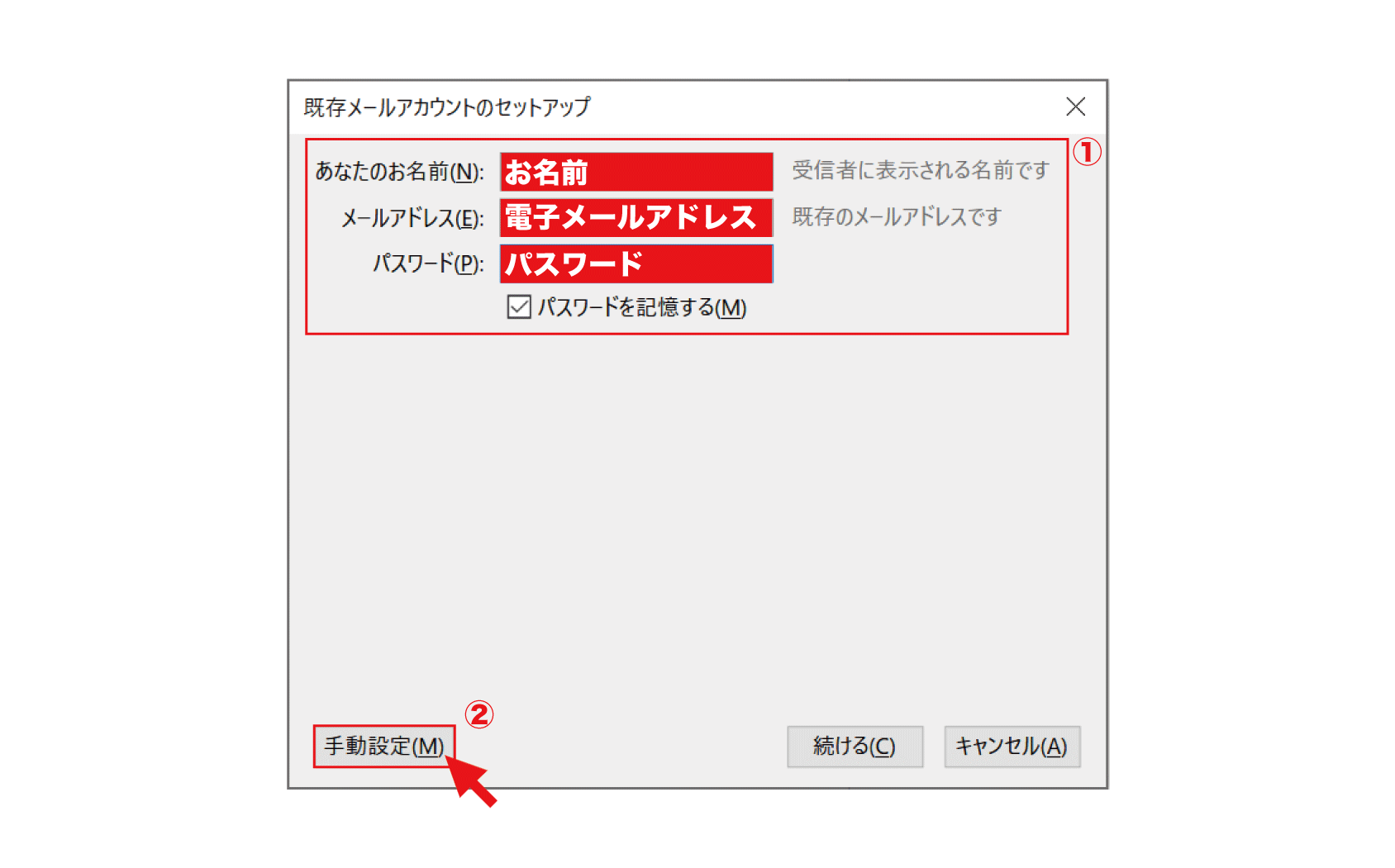 1. Thunderbirdを起動すると以下の画面が出るので、設定を入力し【手動設定】をクリック