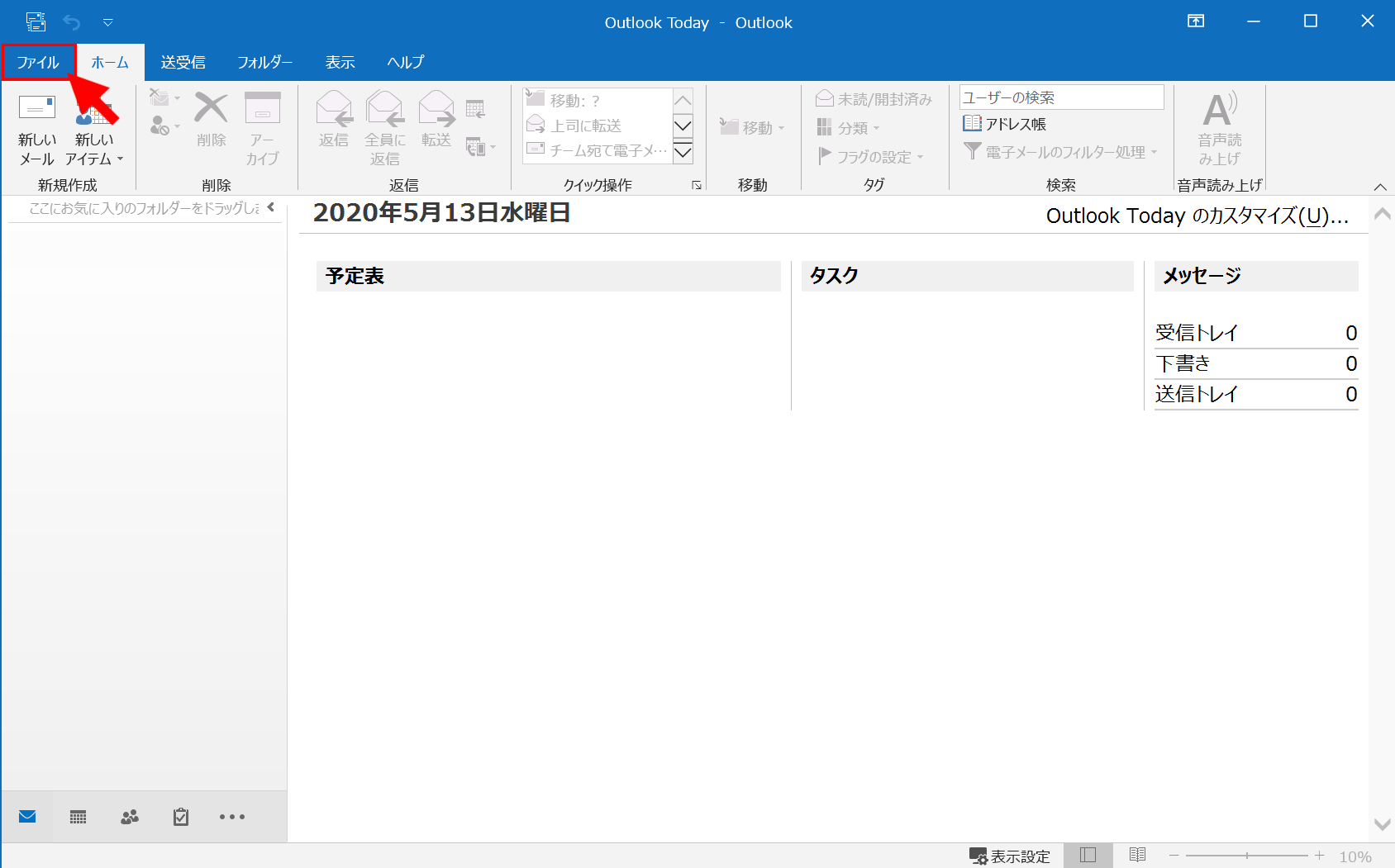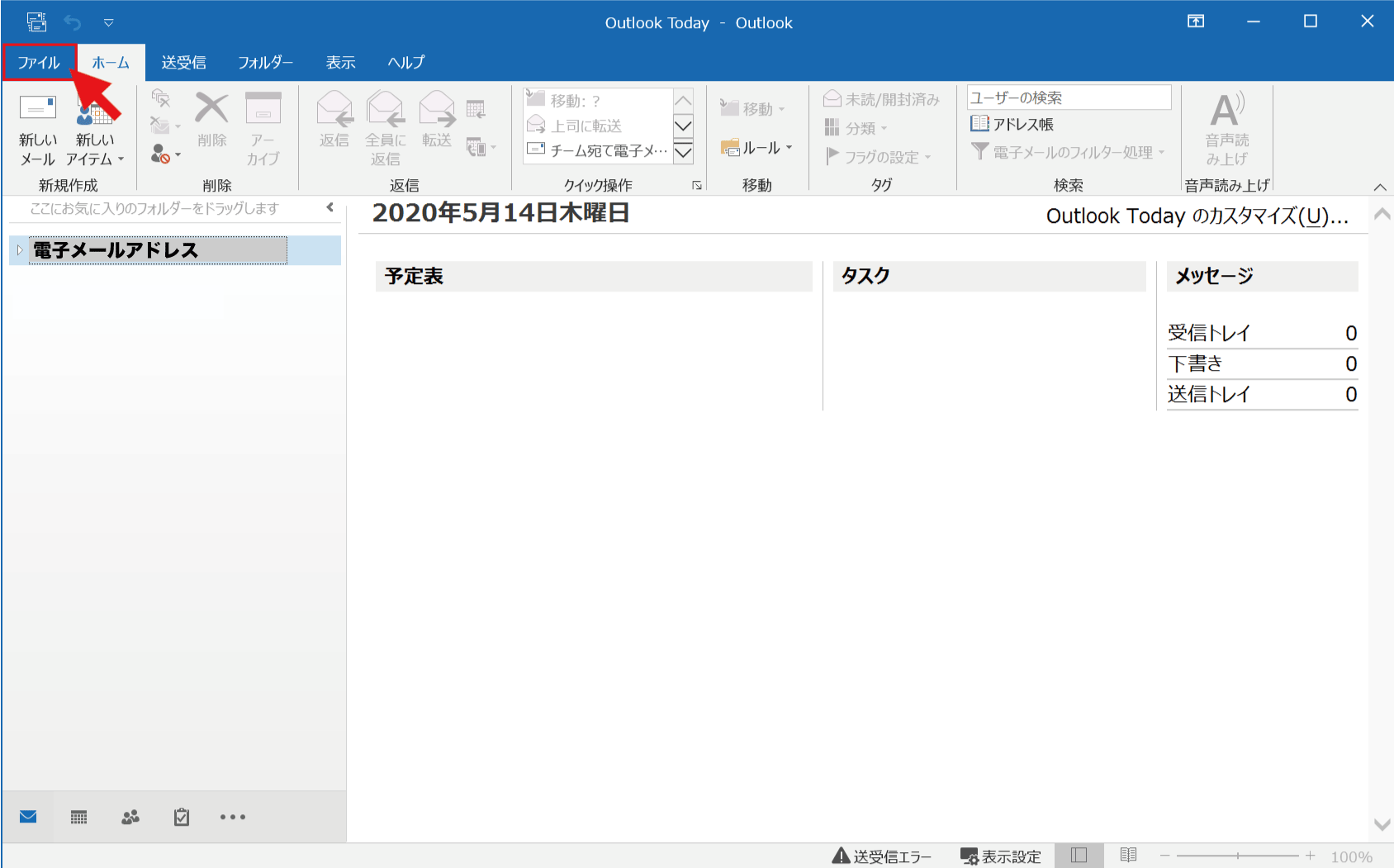 1. Outlookを起動し、左上の【ファイル】をクリック