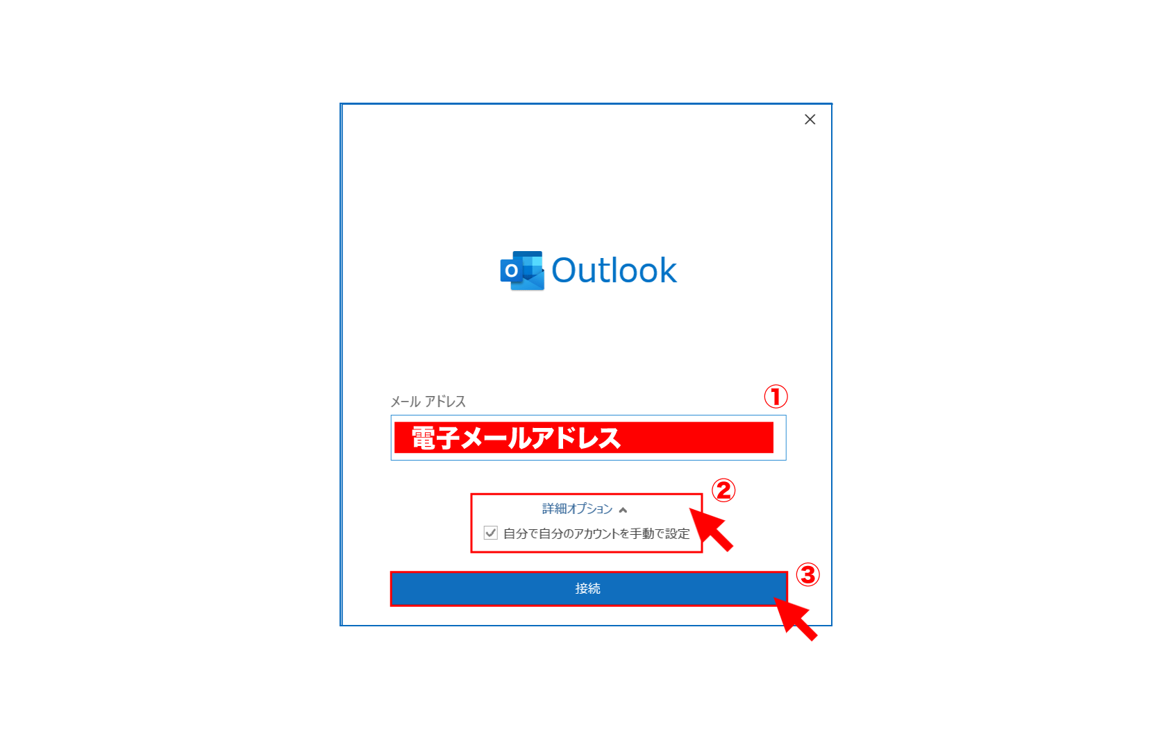 3. メールアドレスを入力し、【詳細オプション】をクリックするとチェックボックスが現れるので、チェック後【接続】をクリック