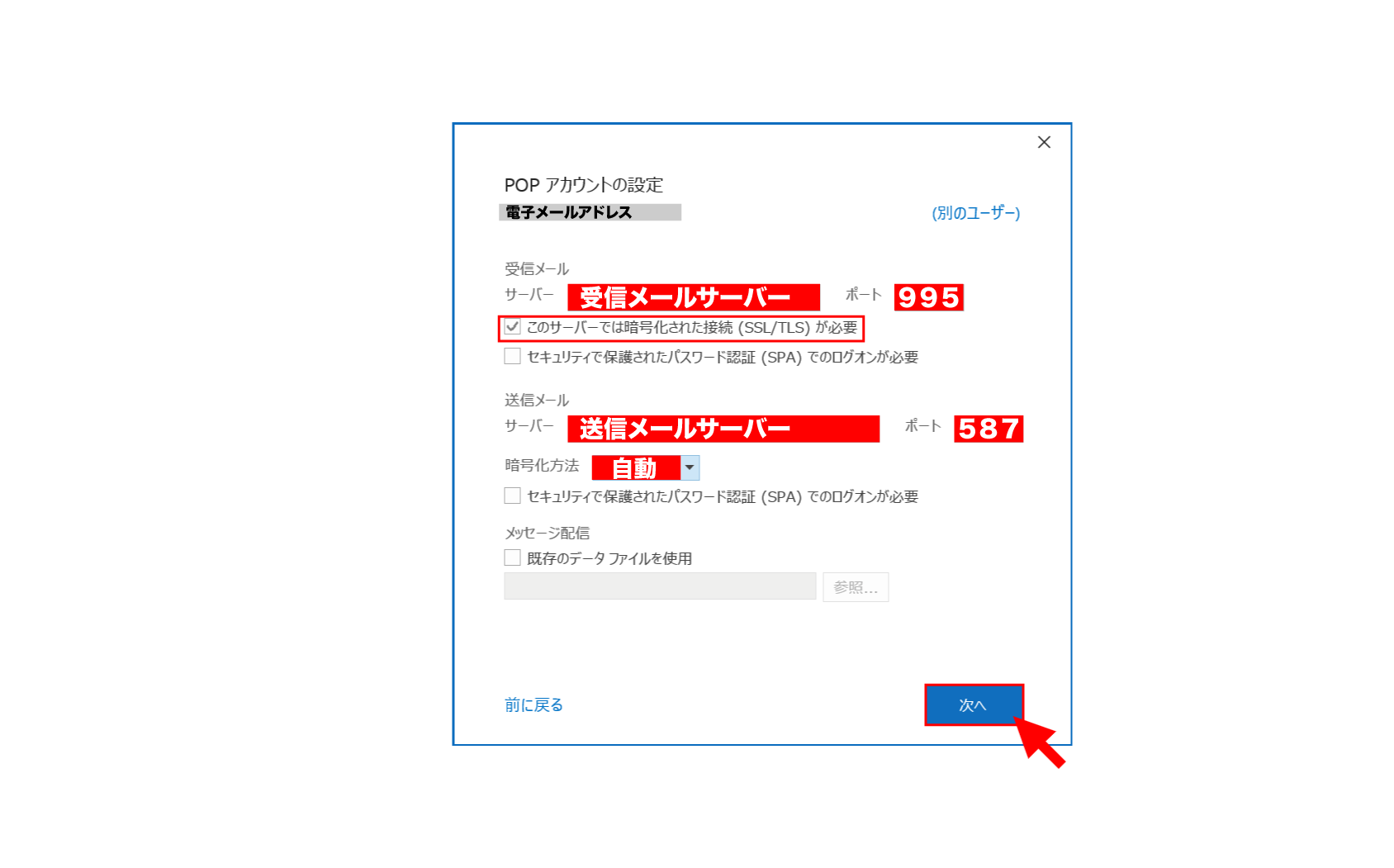 受信サーバー(POP3):995