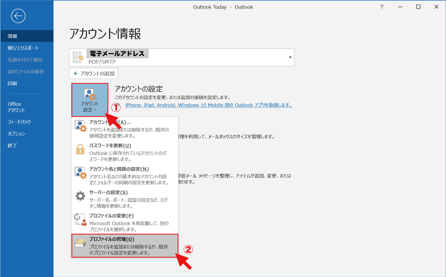 2. 【アカウント設定】を選択し、【プロファイルの管理】をクリック