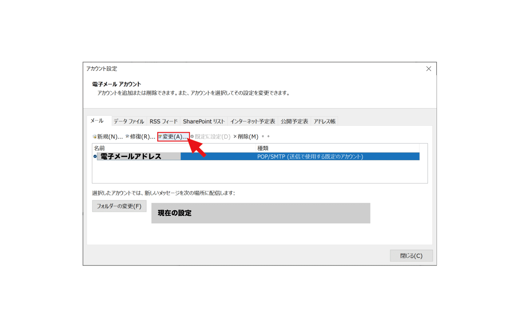 4. 変更するメールアカウントを選択し、【変更】をクリック