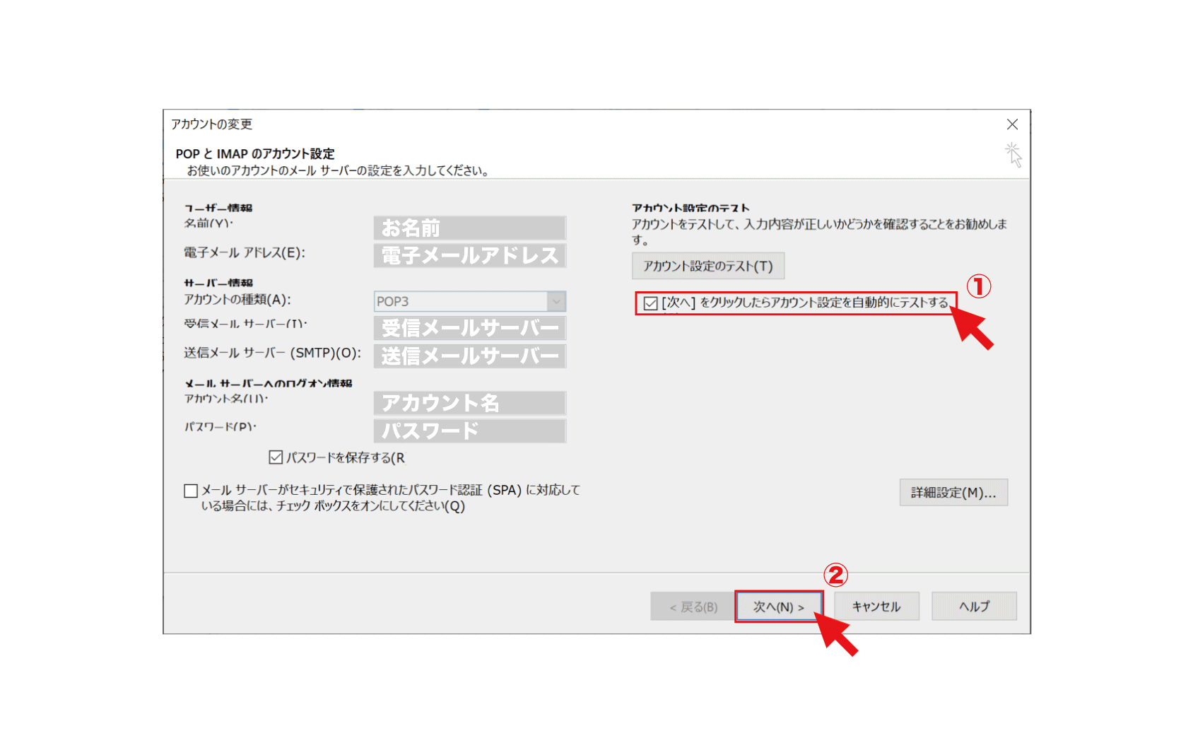 8. 【[次へ]をクリックしたらアカウント設定を自動的にテストする】にチェックをし【次へ】をクリック