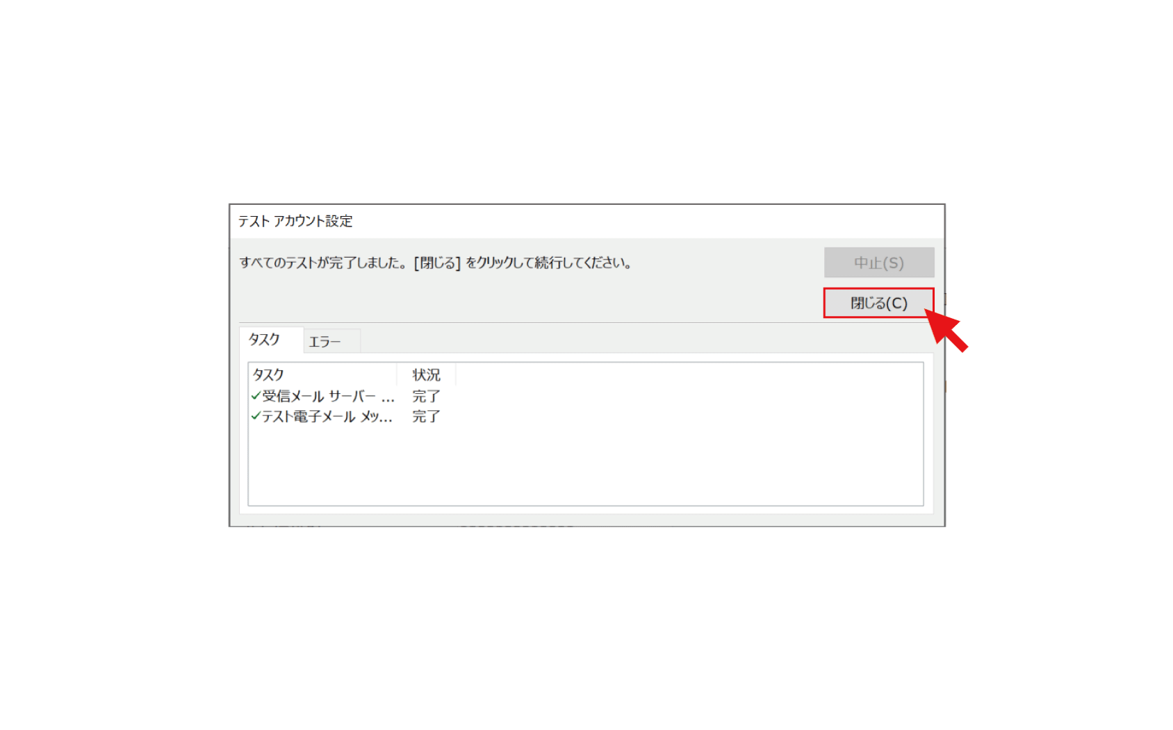 9. アカウント設定テストが完了することを確認し、【閉じる】をクリックで設定完了